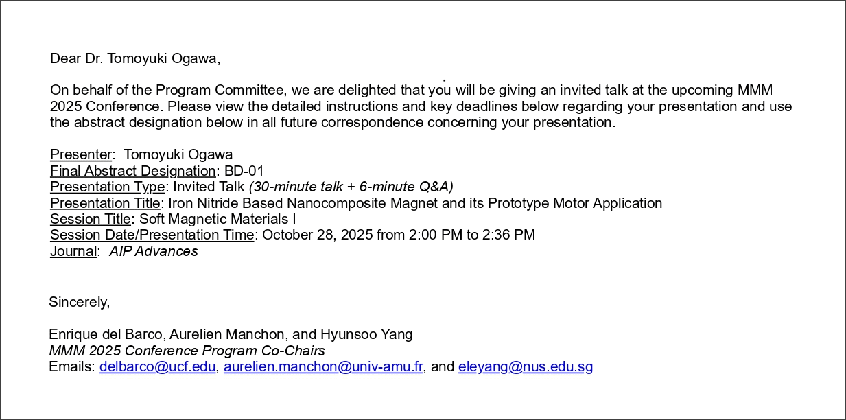 小川智之先生が米国で開催されたThe 70th Annual Conference on Magnetism and Magnetic Materials (MMM2025) において招待講演を行いました。